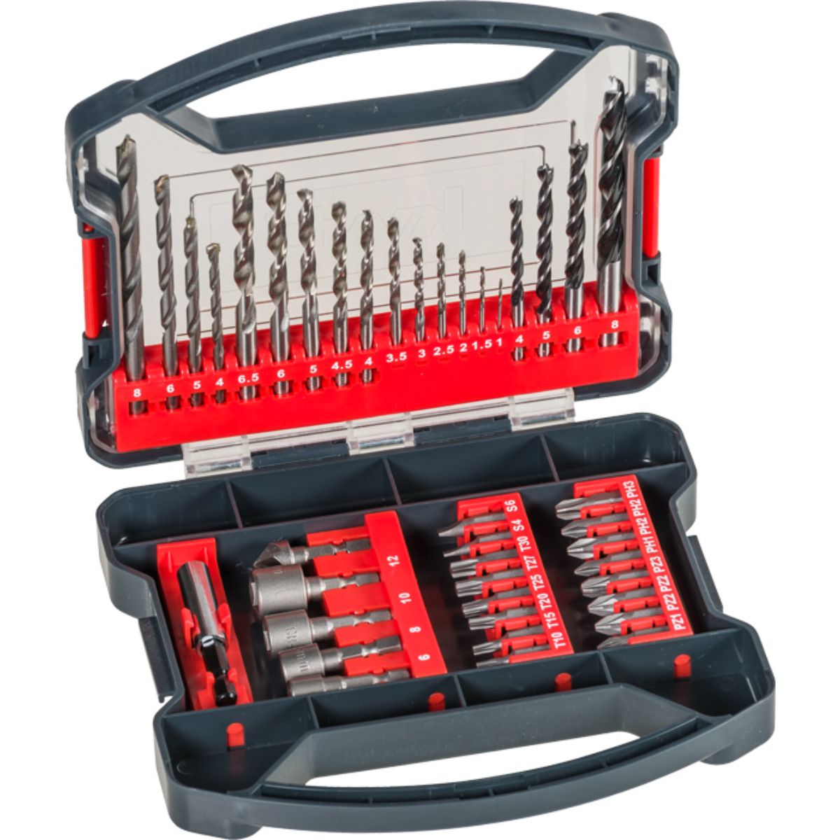 Maletín de plástico estable, con un cierre seguro y asa integrada. El complemento perfecto para destornilladores de batería, taladros recargables y taladros con cable. Amplio surtido de brocas para madera, metal y piedra, vasos hexagonales e insertables, además de puntas en los tamaños habituales. Rápido cambio de puntas con el portapuntas adjunto, incl. avellanador para trabajos en madera blanda a velocidad reducida. Todas las puntas y todos los portapuntas son de acero al cromo vanadio de alta calidad.